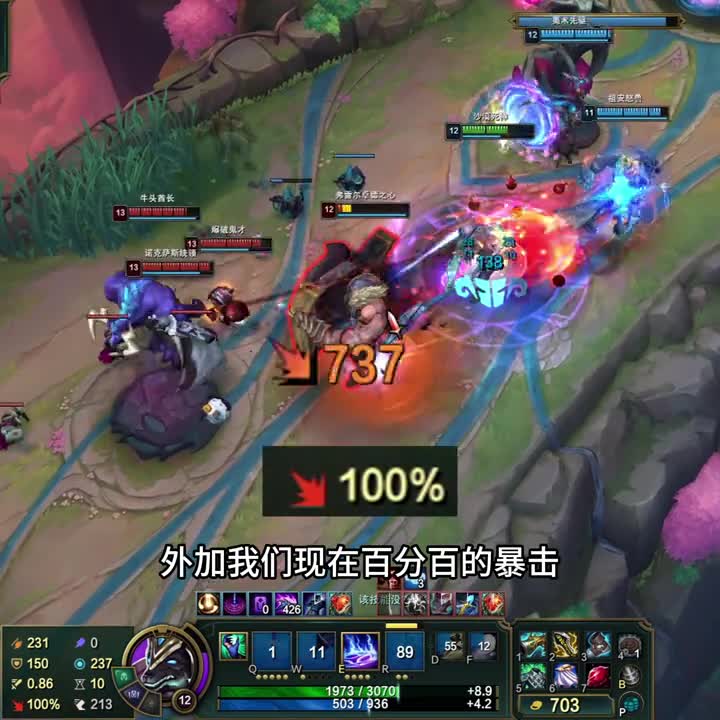 先是拿掉大赏金的牛头,然后开启大招对着对面乌鸦一顿胖揍,接着边别q的同时边吸血。注意炮车一定要吃着吃着就是二十四层被动。