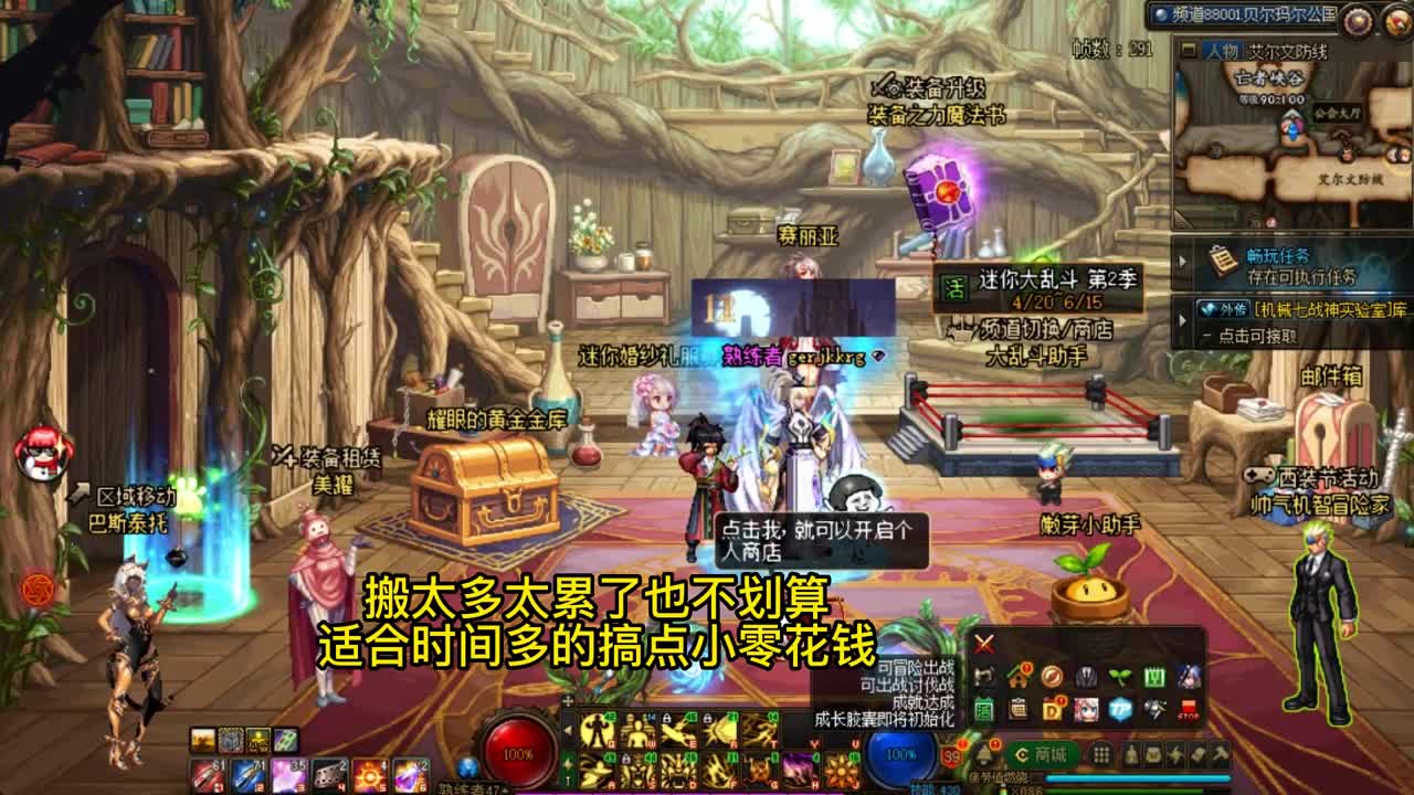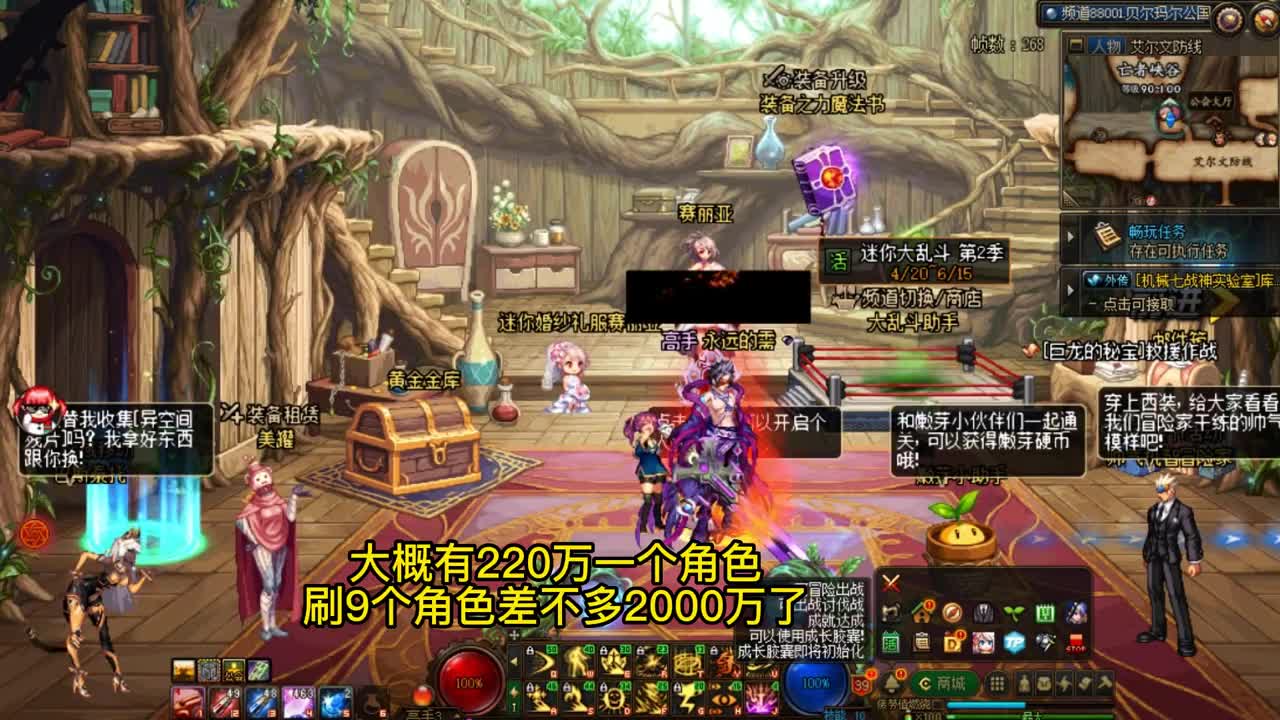 首先每日打王者峡谷五项冥渊,第一狱可以打三个角色获得装备,卖掉三十万左右,接下来前往比拉谢尔号控制板一百一十版本地图去打普通副本英豪噩梦级,我一般是选择永恒之光副本,全图十一点疲劳比较长,刷图也比较有效率,其他副本纳瑟乌森林海、伯伦、科涅恩山也可以,哪个副本刷的比较快有效率,就是那个海波轮需要走这条中间路线,收益比较高,收益时掉落的装备金币和通关的装备金币,白蓝紫色装备全部丢商店快速处理。史诗装备分解,分解的史诗灵魂在装备之力魔法师商店兑换,灵魂之源,卖掉打完一百八十八点疲劳活动送的黑钻,一个角色平均收益在两百万左右,如果能打三s高评分收益会更高。