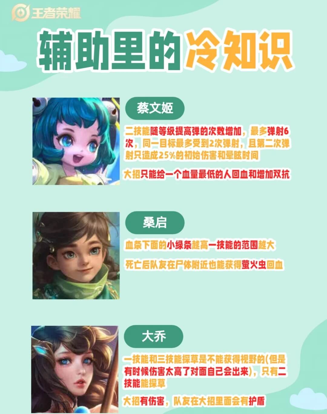 | 大乔 | 1. 一技能和三技能无法直接获得视野(但高伤害可能逼出敌方),只有二技能可以探草。2. 大招本身有伤害,且队友在大招范围内会获得护盾。 |