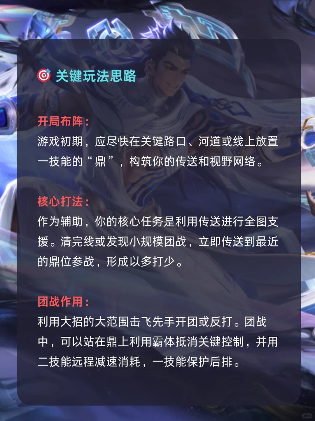 | 被动 | 站在自己召唤的鼎上可获得霸体,并能在不同鼎之间传送,实现超远距离支援和逃生。 | 利用鼎的传送机制快速转线、支援队友或脱离战场,站在鼎上免疫控制,提升生存与开团能力。 |