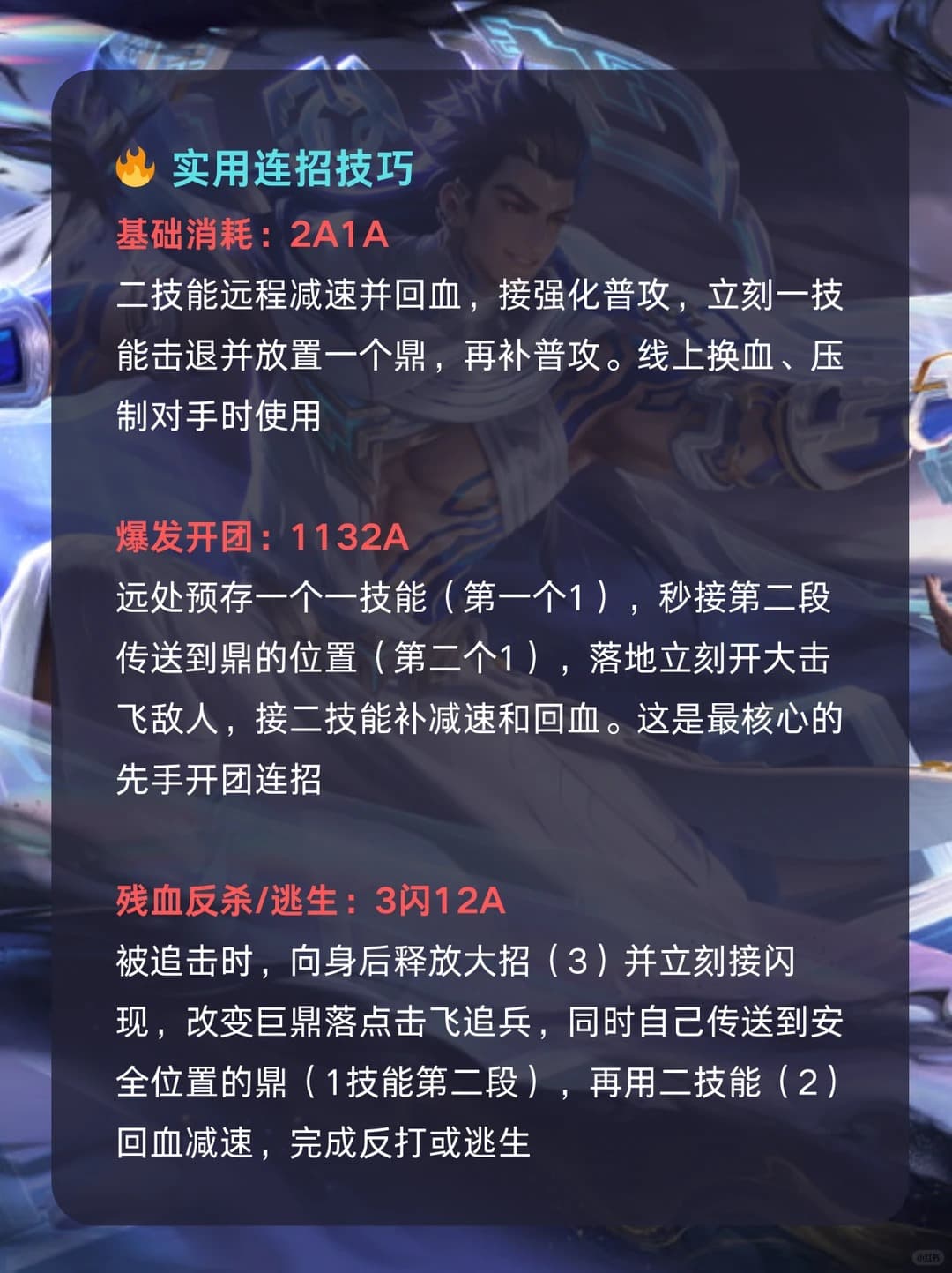 | 残血反杀 / 逃生 | 3 闪 12A | 1. 向身后释放大招(3)并立刻闪现,改变巨鼎落点2. 击飞追兵,同时传送至安全位置的鼎(1 技能第二段)3. 二技能回血减速 | 被追击、残血反打 | 反制追兵 + 快速撤离,提升生存与反打能力 |