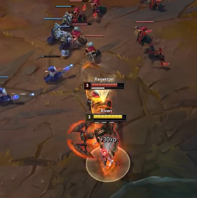 一级老规矩极限CD卡Q攒被动,有三段Q找机会拍他骸骨,可以ALL IN,锐雯一级爆发比鳄鱼强太多Q技能CD也快。