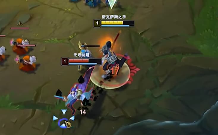 一级上线学W探草,能不能逮到她,剑姬一级换血还是比较弱的,她要打就跟她拼拉扯一下她往哪走你也往哪走避免A破绽。