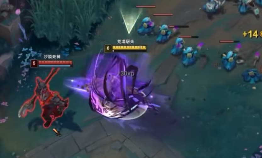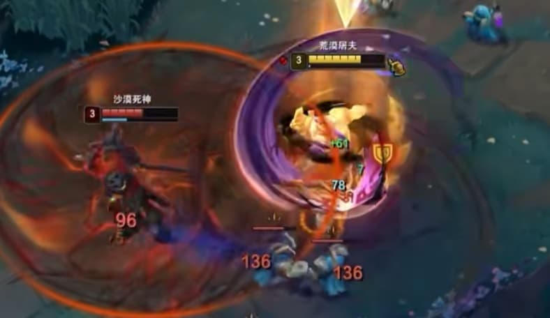 他血量比较低的时候咱们就捏住W,咱们也别嗑药,坚毅不倒会增伤Q的伤害,而且半血的鳄鱼怒气是1.5倍的。