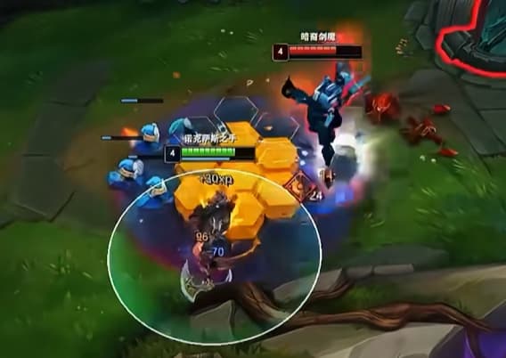 怎么跟他换血呢,躲掉一段Q,二段Q直接贴贴AW,然后往后扭一下,他没E的时候放技能很呆,吃经验就会被打。