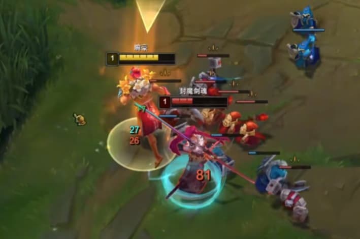 这个时候如果他还不走,等E快转好,A小兵一个左拳,闪现右拳E过来,左右拳点燃他就没了。