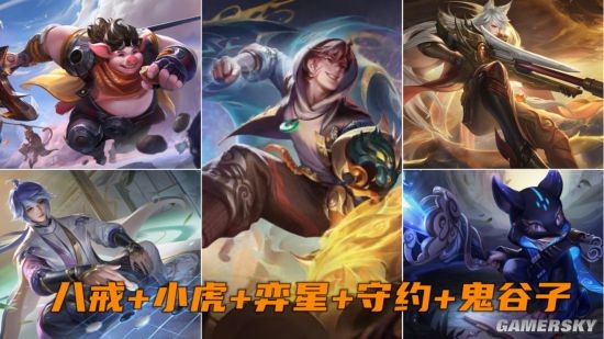八戒+小虎+奕星+守约+鬼谷子这套阵容是以老虎为核心,八戒弈星为辅的阵容;比赛前期,中辅抢线之后就可配合强势的小虎“无脑”进野,而八戒在前期的强度,能够完美弥补团队坦度的短板配合己方中野辅入侵;这套阵容搭配的要点在于,小虎虽然强势但没有控制与坦度,也就选择弈星、鬼谷子来补足控制与伤害,八戒来填补坦度与控制,技能够完全解放并放大小虎在前中期的强度。鬼谷子拉到人,弈星留到人,八戒控到人,小虎直接收割就好,只要小虎顺,就可继续反野推塔控龙运营比赛节奏;对于射手位来说,由于鬼谷子的保c能力较差且这套阵容需求于前中期发力,射手就需要选择一个前中期较为强势的英雄,而守约既有高强度又有开视野探隐形的能力,还可避免对手选择针对鬼谷子,妥妥的不二之选,如果不会守约可以替换为阿离,而中单不会弈星可替换为周瑜、墨子。