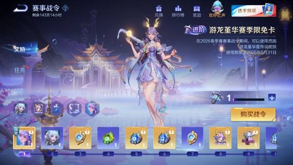 - 1 级:西施 - 游龙堇华星传说赛季限免卡(战令期间拥有游龙清影皮肤 / 限免卡即可使用星传说)