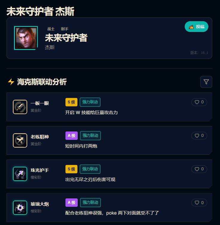 结合16.1版本海克斯效果与杰斯技能机制,四款核心海克斯适配性拉满,优先级排序为:珠光护手 > 一板一眼 > 老练狙神 > 玻璃大炮,各款海克斯的玩法细节与联动技巧如下:
